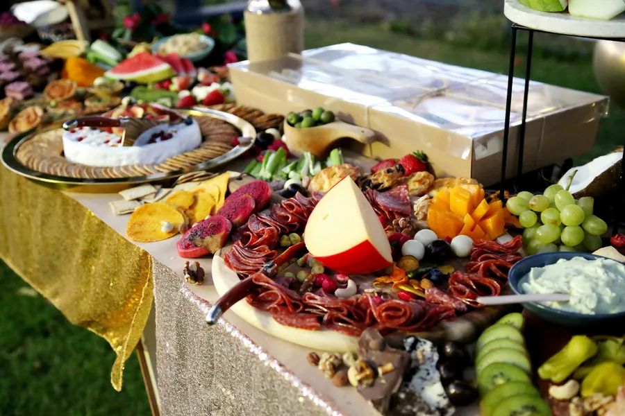 Buffet de mignardises pour mariage ou événement. Présentation élégante avec variété de bricks, mezze et dips.