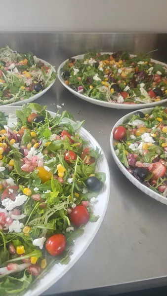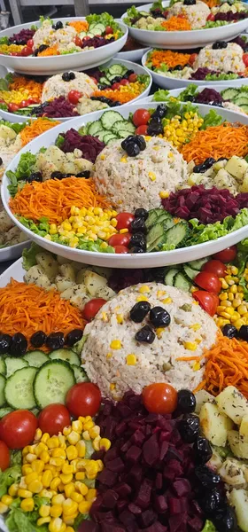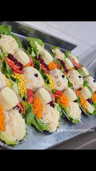 Salade de riz méditerranéenne élégante et colorée pour vos buffets de mariage. Riz basmati parfumé, légumes croquants multicolores (poivrons rouges, jaunes et verts, tomates cerises, concombre, maïs doux), olives noires, herbes fraîches (menthe, persil, coriandre) et vinaigrette citron-huile d'olive. Présentation soignée en grand plat ou en portions individuelles verrines. Entrée froide fraîche et légère, idéale pour les réceptions estivales. Végétarien disponible. De 50 à 400 personnes. Service traiteur mariage à Marseille.