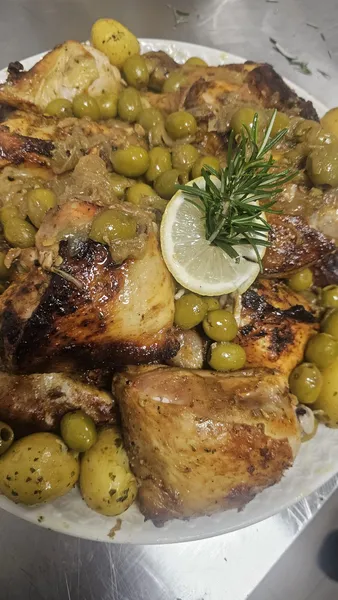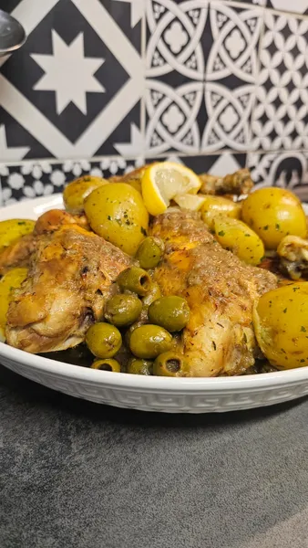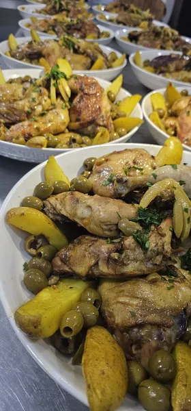 Tajine au poulet aux olives et citron confit, spécialité méditerranéenne mijotée. Poulet fermier tendre, olives vertes charnues, citrons confits maison, oignons fondants et mélange d'épices traditionnelles (safran, gingembre, curcuma, coriandre). Cuisson lente au tajine pour des saveurs authentiques. Sauce onctueuse et parfumée. Accompagné de pain traditionnel ou semoule. Idéal pour vos repas et événements. Portions de 6 à 40 personnes. Halal. Traiteur méditerranéen à Marseille.