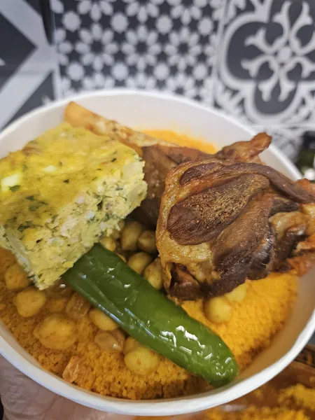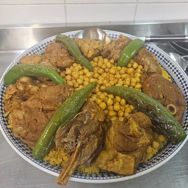 Couscous tunisien authentique à l'agneau, préparé selon la tradition familiale tunisienne. Agneau d'épaule fondant mijoté longuement aux épices (ras el hanout, carvi, curcuma), semoule fine roulée à la main et bouillon corsé parfumé. Présentation traditionnelle avec viande au centre entourée de légumes colorés. Servi avec harissa maison et bouillon à part. Plat généreux idéal pour grandes tablées familiales et événements. Portions de 15 à 80 personnes. Halal certifié. Traiteur tunisien authentique à Marseille.