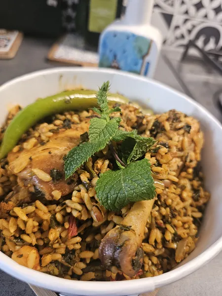Riz djerbien, spécialité culinaire de l'île de Djerba en Tunisie. Riz long grain parfumé aux épices traditionnelles (curcuma, cumin, carvi), viande d'agneau ou poulet tendre, légumes fondants et pois chiches. Plat complet et généreux, idéal pour vos repas de famille et événements. Préparation maison selon la recette authentique djerbienne. Portions de 8 à 40 personnes. Halal. Traiteur tunisien à Marseille.